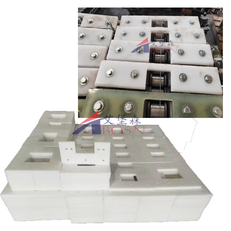 聚乙烯刮板,用超高分子量聚乙烯是制造刮板输送机的中板,可解决钢制中板所存在的问题,得到塑料刮板输送机。对于小型刮板输送机可以通过改性超高分子量聚乙烯来制造刮板输送机。对于上面行走采煤机的大型刮板输送机,要采用钢塑复合的方法,用超高分子量聚乙烯作为衬里,提高大型刮板输送机的耐磨性,延长使用寿命,降低摩擦系数,从而降低功率消耗并降低对牵引、传动系统的要求,这对大型刮板输送机有巨大意义